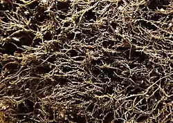 Ephebe species form dark brown-to-black mats of fine, hair-like filaments that creep across rock and bark surfaces like a tangled carpet. Each tuft is attached at a single point by a small holdfast, then branches repeatedly to create an intricate web. Because the filaments lack a true outer skin (cortex), the fungal threads, or hyphae, lie directly on the surface; when young they surround the partner alga but later organise into a loose central strand. The algal associate is from the cyanobacterial genus Stigonema, which grows as bead-like chains of cells and gives the lichen its ability to fix atmospheric nitrogen.[7]