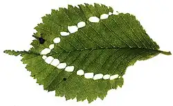 Larvae can be found from April to June, with early instars initially feeding within a developing bud, perforating the leaf. As the bud opens, the leaf expands to show the distinctive feeding pattern. Later they feed in a spinning on another leaf. Field maple (Acer campestre) is also eaten and larvae have been found on greater stitchwort (Stellaria holostea), which indicates it will eat herbaceous plants if dislodged from its normal feeding place on elm.[4]