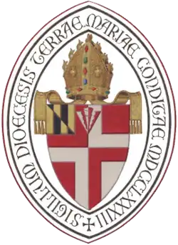 The arms of the diocese were designed by Pierre de Chaignon la Rose and were officially adopted at the 133rd diocesan convention in 1916. They consist of a counterchanged Cross of St George, representing the ancestral Church of England; a canton of Lord Baltimore's arms, representing Maryland; and a pheon or arrowhead, taken from the arms of Bishop Claggett.[10]