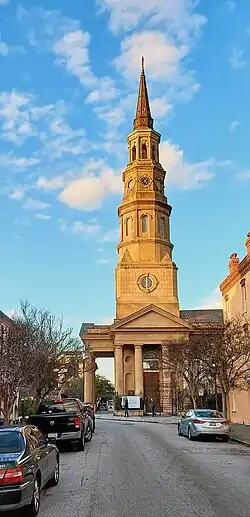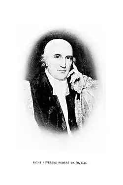 During the American Revolution, dissenters successfully advocated for the disestablishment of the Church of England and ensured that all Protestant religions were treated equally with the adoption of a state constitution in 1778 (equality was extended to Catholics and Jews in 1790).[17] The first state convention of the Protestant Episcopal Church in South Carolina was held on May 12, 1785.[18] In October 1790, South Carolina's state convention unanimously accepted the constitution and canons for the national church adopted by the General Convention at Philadelphia earlier in July 1789.[19] Robert Smith was elected South Carolina's first bishop on February 10, 1795, at the 12th convention.[20]