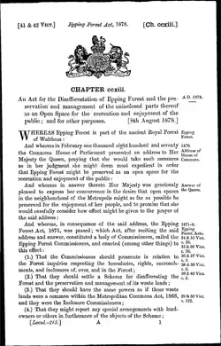 During the middle of the nineteenth century, a number of initiatives were started to protect the rights of the public to use open spaces and for the areas to be conserved for their specific environmental features. Some notable people of the time devoted themselves to societies such as the Commons Preservation Society, now known as the Open Spaces Society, in order to gain protection for some clearly defined areas . One of these areas was Epping Forest on the outskirts of London. It was an area beginning to suffer encroachments of building development and enclosure. The local people of Loughton were also, by tradition, taking a limited quantity of wood from the forest under what was termed their 'lopping rights'. The enclosure of the lands within the forest bounds was threatening the performance of the annual lopping tradition and thus, a dispute also arose over the removal by private individuals of forest considered to be in public ownership. Following the intervention of a number of bodies and interested parties, some Acts of Parliament were enacted gradually bringing about the desired protections. The Epping Forest Act 1878 (41 & 42 Vict. c. ccxiii) brought together the diverse rules and prescribed how the Forest was to be protected. The Act formally records the Crown renouncing rights over the land and the Corporation of London, having bought acres of unenclosed Epping Forest land, named as the official conservators.[1]