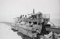 The load was stored in two containers on either side of the vehicles, to keep the center of gravity as low as possible, similar to loading the saddle bags of a mule. The locomotives had a design similar to the carriages. The first locomotive was battery-operated, but it was not powerful enough to tow loaded trains. Therefore, seven conventional Fordson tractors and one Buda tractor were modified to build articulated monorail locomotives.[4]