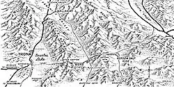 The monorail started at the sidings in Magnesia, crossed the dry bed of the Searles Lake and climbed on a ramp through the Layton Canyon with a gain of 1,800 feet (550 m) in 5 miles (8.0 km), i.e. a 7% gradient. It passed the Layton Pass, whose summit is 3,500 feet (1,100 m) above sea level,[1] and followed a steep canyon downwards to the bed of the Panamint Valley with only one road crossing on its way. At the other side of the valley it climbed with a gradient of 10–12% to the Wingate Pass, followed then the Wingate Wash and the Crystal Hills Wash and turned finally eastwards to the camp and mine.[4]
