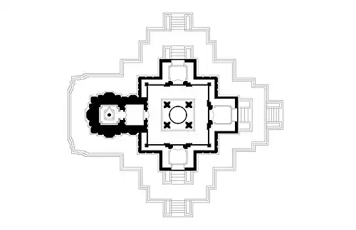 The architectural style of the temple is close to Ramappa temple and Kota Gullu, other Kakatiya era temples. The temple is placed on an upapitha and is cruciform in shape.[14][15] It has three porticos in the east, north and south and a garbhalaya in the west. The sikhara on the inner sanctum (garbhagudi) is made of brick and lime and is decorated all over by miniature turrets. It is said that the stone used in temple construction has interesting acoustic properties. When the temple stone is tapped with a coin, it sounds like metal.[15] The temple has intricately carved pillars and walls. The temple walls are painted with frescoes.