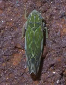 Adults have a body size of roughly 2.7-3.2mm long and their body has a yellow stripe that longitudinally divides it.[9] A seasonal color dimorphism occurs, with the summer population possessing a red transversal vein at the base of the first apical cell.[10] The summer population also has bluish patches on their forewings. At the end of the season, these become more green-brown whereas the transversal veins often appear white.[10] The nymphs have yellow marbled patches over a reddish-brown body with light green legs.[9] The thorax and vertex is dorsoventrally flattened.[10]