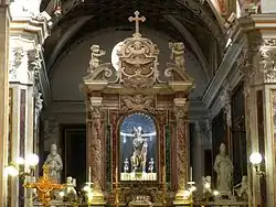 Resina's main industries were agriculture, fishing (including collecting corals, an activity also performed by the inhabitants of Torre del Greco),[4] and the cutting and carving of volcanic stone. In the 16th century the veneration of the Madonna di Pugliano, who was venerated in the church of Santa Maria a Pugliano, was so widespread that large numbers of pilgrims flooded in from the surrounding areas. In 1574 the church was first mentioned as Basilica pontificia; two years later it became the parish church of Resina, the parish also including the neighbouring town of Portici until 1627.