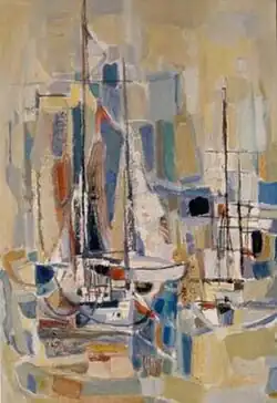 Originally influenced by Impressionism, Kalmık later became interested in European Cubism and was influenced by Braque, Picasso, Fernand Léger and Henri Matisse. After returning to Turkey he maintained an interest in figurative abstraction and developed a strong sense of pattern. During the 1960s many of his works featured fishermen and boats in front of abstract landscapes. Kalmik is known for his etchings as well as his prints. He also produced some public mosaics, including the fine one on a wall in 4.Levent, Istanbul. [2]