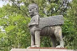 A cuneiform inscription testifies that the city was built by Argishti I the King of Urartu in 782 BCE. The majority of the fortress was built from raw bricks. The citadel was encircled by strong walls in some places built in three rows. The temple of God Khaldi occupied an important place in the fortress. The walls of the temple were decorated with numerous frescos. Archeologists have found giant karasses (pitches for storage of wine) buried in the ground. Ceramics, potter's wheels and other articles used in everyday life were also unearthed during excavations. There is huge collection of artifacts, sups, jars, bronze bracelets, glass, agate beads and many other things that tell us about the life of the citadel, the tastes and habits of its inhabitants. The building of the Museum that houses 12,235 exhibits was constructed by architects Baghdasar Arzoumanian and Shmavon Azatian and sculptor A. Harutiunian. It has two branches in Shengavit and Karmir Blur with 5,288 and 1,620 exhibits respectively in stock.[2] The sculptural design of the museum is the history of the ancient state of Urartu, represented by plastic means of expression. For sculpture of Erebuni Museum in 1970 Ara Harutyunyan was awarded a diploma of the USSR Union of Architects for the sculptures on the museum building.[3]