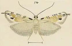 ♂♀ 10-11 mm. Head, palpi, thorax whitish, palpi slender, second joint with several lateral projecting bristles towards apex, terminal joint shorter than second, filiform. Antennae nearly as long as forewings. Forewings elongate, apex pointed, produced, termen slightly sinuate, very oblique ; pale ochreous-yellowish with bases of scales grey ; a large acute wedge-shaped whitish patch based on basal third of costa with apex extending to disc at 2⁄3, a white nearly longitudinal streak beneath posterior half of this, and separated from it by blackish ; a blackish blotch along basal fifth of costa ; costa from 1⁄3 to apex white, between 1⁄3 and 3⁄4 with about eleven black more or less oblique strigulae arranged in three irregular groups ; an irregular white streak along termen, terminated above by a small black anteapical spot with an anterior projection margined beneath by a silver}/ mark, itself edged grey beneath (a fine grey line a little below this), and below middle immediately preceded by a rather larger black spot ; a black apical dot ; cilia light silvery grey, on costa a dark fuscous basal line towards apex, and dark fuscous projecting hook beyond it. Hind wings with 5 and 6 separate ; light brassy-grey ; cilia whitish-grey.[4]