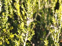 Eremaea pauciflora is an erect, spreading or densely foliaged and rounded shrub sometimes growing to a height of 2 metres (7 ft). The leaves are 2.9–7.9 millimetres (0.1–0.3 in) long, 0.6–3.3 millimetres (0.02–0.1 in) wide, linear to narrow egg-shaped with the narrower end towards the base. Sometimes one or 3 veins are visible on the lower surface.[2]
