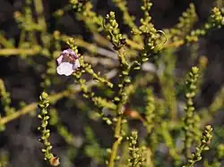 The flowers are borne singly in leaf axils on a straight, mostly glabrous stalk 1–2.2 mm (0.04–0.09 in) long. There are 5 overlapping, green or blackish-purple, egg-shaped, tapering sepals which are 1.5–3.3 mm (0.06–0.1 in) long. The petals are 6.5–10.5 mm (0.3–0.4 in) long and are joined at their lower end to form a tube. The flower buds are blackish brown but the open to purple on the outside and white with purple spots inside the tube. The petal tube is glabrous apart from the inside of the tube and the lower petal lobe which have long, soft hairs. The 4 stamens extend beyond the petal tube. Flowering time depends on subspecies. The fruits are woody, cone-shaped to almost spherical and 2.5–4 mm (0.1–0.2 in) long.[2][3][4]