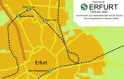Since all the tracks were already in place, only two new stations had to be built. Thus, the connection could be opened on 13 May 1976 after a construction period of only three months.[3] The line length was 8.6 kilometres, of which 2.7 kilometres were on the line of the former light railway. In the Kursbuch of Deutsche Reichsbahn, the line was listed under route number 642. There was no interval timetable. The trains operated only during the rush hours. On working days, eight (1985) or nine (1990) train pairs commuted on the line. Half of the trains only travelled to or from Erfurt Nord. There were connections to trains in the direction of Erfurt Hauptbahnhof. Because the main patronage of the S-Bahn came from workers of the VEB Pressen- und Scherenbau "Henry Pels" (later VEB Umformtechnik Erfurt "Herbert Warnke"; factory currently owned by the Schuler Group), as well as DR employees, traffic was suspended on Saturdays, Sundays and public holidays.[7]