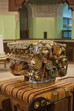 In 2012, van Hove arrived in Marrakech, Morocco to resume work on an ambitious sculptural endeavor he had prepared for years: V12 Laraki. In the space of nine months, van Hove gathered around him 42 master craftsmen from the region and began rebuilding a Mercedes 6.2L V12 engine using rural materials and centuries old craft techniques from the North African country. Conceptually this sculpture is based on the story of the Laraki Fulgura, a Moroccan supercar by Industrial designer Abdeslam Laraki. While the Fulgura was entirely manufactured in Morocco to the exception of its engine, the artist decided to try and reproduce that cutting-edge component locally using craft, which accounts for 20% of the country’s work force[18] and he saw as an unjustifiably neglected part of the national industry.