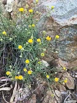Erigeron reductus grows in rocky habitats in several mountain ranges in the northern part of the state. It is a perennial herb producing several spreading to erect stems up to 30 centimeters (12 inches) long from a woody caudex and root system. Each stem is lined evenly with small, thready leaves and topped with an inflorescence of one or more flower heads. Each glandular flower head is up to a centimeter (0.4 inches) wide and contains many yellow disc florets but no ray florets. The fruit is an achene with a pappus of bristles.[2]