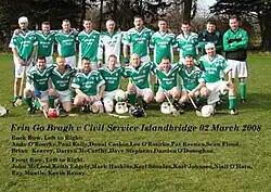 The club was listed as having a hurling team in 1887 and again in 1921, however there is little or no information on hurling's history in Erin go Bragh. In early September 2005 Erin Go Bragh introduced Hurling and Camogie to the Littlepace/Castaheaney area. A junior hurling team was set up during the summer of 2007 with a view to competing in the 2008 hurling season. The hurling team played their home games at Saint Catherines due to the club's current pitch in Castaheany/Littlepace close proximity to houses in the area. The team was set up and managed by Kevin Kenny and captained by Karl Johnson. The hurling team's first match was a friendly against St Peregrines on 30 September 2007. Their first competitive match was against Civil Service hurling club in Islandbridge [4](picture below). They finished in 11th position in AHL 8 in 2008 and reached the quarter-finals of the Junior E hurling championship losing to eventual runners up St. Josephs OCB in their first season.