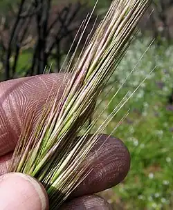 The grass bears a generous inflorescence up to 60 centimeters long with large spikelets up to 2 centimeters long each, not including an awn of up to 4.5 centimeters. The awn has two distinct kinks.