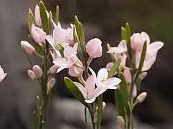 Eriostemon australasius commonly known as pink wax flower is a plant in the citrus family Rutaceae and is endemic to eastern Australia. It is an erect, bushy shrub with narrow oblong leaves and pink flowers with five petals in late winter and early spring.