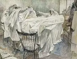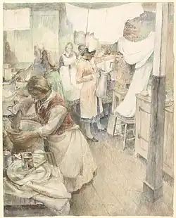 At the start of World War II, Hudson went to Leicestershire and then to Kent, where she delivered her sister-in-law's baby when it was born prematurely during a thunderstorm. In Leicestershire she lived with her brother, the vicar of Ashby Magna, and his family. Here Hudson sketched local women preparing dried herbs and flowers which were sent to hospitals for medicinal uses. She also drew the canteens in Leicester where she helped with packing supply parcels for prisoners of war.[5] Back in London, she moved to a fourth-floor flat in Earls Court and witnessed first-hand the death and destruction of the Blitz. She volunteered as a driver of a mobile canteen, actually a converted laundry van, and made tea and sandwiches for the rescue services attending at bomb sites. Later, she recalled how after a block of flats were bombed, bodies and limbs were strewn around. Visiting her mother in Torquay, she witnessed a similar scene in the aftermath of a bomb destroying a school. Hudson didn't draw these scenes, instead preferring to concentrate on depicting women volunteers hard at work for the war effort. She produced hundreds of paintings and drawings during the war.[3] At Robert Austins suggestion she contacted the War Artists' Advisory Committee, WAAC, who purchased six of her drawings, including Village Women Drying Wild Herbs and WVS Bandage Making. These were displayed in WAAC exhibitions at the National Gallery during the war and then acquired by the Imperial War Museum.[6]