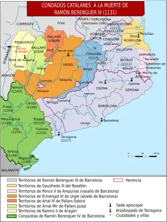 Ermengol collaborated with Alfonso the Battler in the 1118 capture of Zaragoza and in the expedition of Alfonso VII the Emperor, for whom he served as mayordomo mayor,[4] against Almería in 1147.[1] In 1146, he was one of the commanders of Alfonso's army at the battle of Albacete.[5] In 1133, Ermengol ceded Andorra to the Bishop of Urgell.[6] He had good relations with the House of Barcelona and he accompanied Raymond Berenguer IV to Provence in 1144. In 1149, he assisted Raymond Berenguer in the conquest and repopulation of Lleida,[1] receiving one-third of the city,[7] which was thenceforward part of his dominion.
