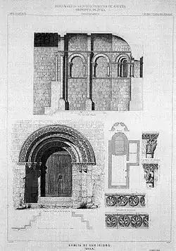 In the 19th century, the church was under the ownership of the Asociación de Labradores (Association of Farm workers), during which it transitioned its patronage to Saint Isidore. Around 1854, the edifice suffered significant damage, prompting the City Council to mandate the Association to demolish it. The Association offered the temple to the City Council, but the offer was declined. Preparations were made to initiate the necessary demolition work. However, years passed without any action being taken until 1876, when the State enforced the law of Confiscation. This led to the demolition of the church in 1877, with the remnants of the structure being sold to private individuals. This allowed a neighbor of Ávila to buy most of the stones.[2] Emiliano Rotondo Nicolau, engineer and businessman with an interest in archaeology and resident of Madrid, purchased the remaining ashlars and architectural elements. After a failed attempt of sell to the City Hall of San Sebastian, Rotondo Nicolau sold the ruins to the Real Academia de la Historia in 1893 for 18.000 pesetas.[3] The new location of the church was within the gardens of the Museo Arqueológico. Its purpose extended beyond being a relic of the Romanesque era; it was designated for use as a chapel where Mass would be conducted every Sunday following the Mozarabic Rite.