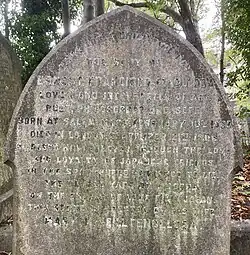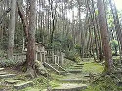 In 1900, Fenollosa returned to the United States to write and lecture on Asia. He died of a heart attack during a visit to London in 1908.[10] His body was briefly interred on the eastern side of Highgate Cemetery, in London, but later cremated. According to his wishes, his ashes were returned for burial to the Hōmyō-in chapel of Mii-dera (where he had been tonsured), high above Lake Biwa. His tombstone was paid for by the Tokyo School of Fine Arts.[12]