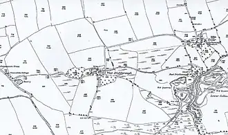 In 1773 the mansion house was a ruin, with only a tower remaining.[11] In 1902 "Irishborough manor house" was the property of Rev. Henry Tubal Hole, Rector of Plympton St. Maurice.[40] The site is today covered by the central settlement of "West Irishborough", which in the 18th century had the status of barton[41] or principal farm, and to the east on the edge of the historic curvi-linear estate, "Tower Farm",[8] believed to have been the site of the mansion house[42] of the Mules family.