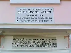 An inscription in the door cornice of the front facade refers, according to the builder, to "a sweet spot" in the Rügen homeland.[4] Presumably a small oak grove of the same name near Arndt's birthplace Groß Schoritz is meant.[5]