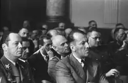At the Nuremberg trials, Kaltenbrunner was charged with conspiracy to commit crimes against peace, war crimes and crimes against humanity.[77] Due to the areas over which he exercised responsibility as an SS general and as chief of the RSHA, he was acquitted of crimes against peace, but held responsible for war crimes and crimes against humanity.[78]