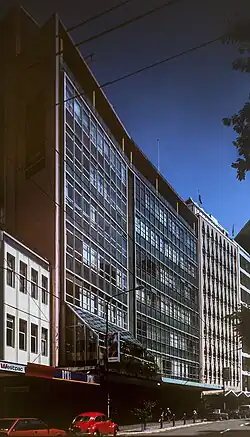 When Plischke arrived in New Zealand in 1939 with his wife Anna, he was already known in architectural circles to be at the forefront of modernist design.[2] He began working for the Ministry of Housing on projects such as the Dixon Street Flats. In 1942, he designed the Abel Tasman Monument for a site in Golden Bay for the tercentenary of Abel Tasman's visit to New Zealand.[3] From 1943 to 1947 he worked for the Department of Town Planning producing work in areas including: Naenae, Trentham, Tāmaki and Mangakino. He also completed private work during this time, including the Frankel House in Christchurch (for Otto Frankel), which was his first commission.[4] Frankel House is a Category 2 entry on the Heritage New Zealand register.[5]