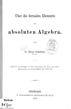 Friedrich Wilhelm Karl Ernst Schröder (German: [ˈʃʁøːdɐ]; 25 November 1841 – 16 June 1902) was a German mathematician mainly known for his work on algebraic logic. He is a major figure in the history of mathematical logic, by virtue of summarizing and extending the work of George Boole, Augustus De Morgan, Hugh MacColl, and especially Charles Peirce. He is best known for his monumental Vorlesungen über die Algebra der Logik (Lectures on the Algebra of Logic, 1890–1905), in three volumes, which prepared the way for the emergence of mathematical logic as a separate discipline in the twentieth century by systematizing the various systems of formal logic of the day.