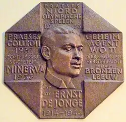 When the war ended De Jonge's older brother Marien returned to the Netherlands and was reunited with his wife and son. Nine months later they had a second son, which they named Ernst in memory of Marien's younger brother.[10] When Marien reached 100 years of age a celebration was held for him, and though happy to be with all his family, he asked ‘Waarom word ik honderd en is mijn broer zo vroeg gestorven?’("Why did I live to be a hundred and my brother died so young?") His family started a fund to raise money for a memorial to his brother. On March 9, 2012, a casting of De Jonge was placed in the Minerva Society at Leiden.[4] Marien de Jonge spoke of his brother at the unveiling ceremony.[11]