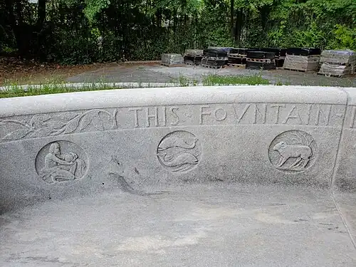 The fountain was built to honor John Erskine, a Federal judge from Atlanta who died in 1895.[1] The fountain, which cost $15,000 to build, was a gift from Erskine's daughter to the city of Atlanta and was dedicated by Mayor Porter King on May 2, 1896.[2] It was the first public fountain in Atlanta.[3] The fountain was originally placed at what is now Hardy Ivy Park, at the diversion of Peachtree Street and West Peachtree Street.[2] The fountain replaced a statue of Benjamin Harvey Hill,[4] which was moved from the location to the Georgia State Capitol, where it still stands.[1] The fountain and accompanying bench were designed by J. Massey Rhind and feature an ocean theme, along with inscriptions of the Zodiac signs.[1] The lower bowl of the fountain originally had bronze cups attached with chains to allow people to drink from it, though these have since been removed.[2]