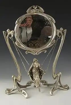 Demoiselle à la balancelle is one of Erté's first sculptures, if not the first; it was made in 1907 at the age of 15 years while he studied in Paris. This work is less precise than his other sculptures, but still Art Nouveau. Erté considered this work so minor and uninteresting that it does not appear in his official biography, but the cartouche on the back indicates 'ERTE PARIS 1907', in a triangle.