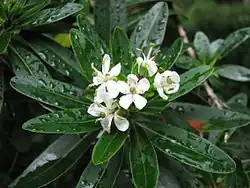It can grow up to 4 m (13 ft) high and 2.5 m (8.2 ft) broad, and has dark green shiny leaves which are 2 to 7 cm long and 0.8 to 2 cm wide. The pure white flowers, initially tubular but then spreading, appear in summer.[2]