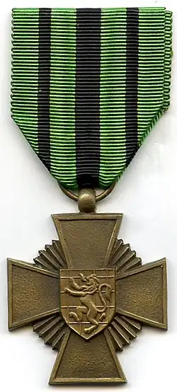 The Escapees' Cross 1940–1945 (French: Croix des Évadés 1940–1945, Dutch: Kruis der Ontsnapten 1940–1945) was a Belgian war service medal established on 25 February 1944 by the Belgian government in exile in London. It was awarded to all Belgian citizens who, during World War II, escaped from occupied Belgium, from another occupied land or from Germany and that, following said escape, had proven their patriotism by joining and serving with a resistance group, or had been imprisoned for a minimum of three months following an act of patriotism, or for having travelled clandestinely to participate in a Belgian action aimed at promoting the war against the enemy. Escaped prisoners of war could also be awarded the medal if they met this last criteria.[1]