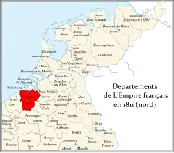 Escaut (French: [ɛsko], Dutch: Schelde) was a department of the French First Republic and French First Empire in present-day Belgium and Netherlands. It was named after the river Scheldt (Escô, Schelde), which is called the Escaut in French. It was created on 1 October 1795, when the Austrian Netherlands and the Prince-Bishopric of Liège were officially annexed by the French Republic.[3] Before annexation by France, its territory was part of the County of Flanders and the Dutch Republic (Staats-Vlaanderen).
