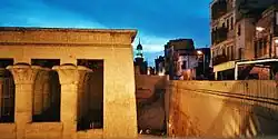 There was a smaller temple, dedicated to the triad of Latopolis, about two miles and a half north of the city, at a village now called el-Dayr. Here, too, is a small zodiac of the age of Ptolemy III Euergetes (246–221 BC). This latter building was destroyed in the 19th century, as it stood in the way of a new canal. The temple of Esna was cleared of the soil and rubbish which filled its area when Vivant Denon visited it, and served as a cotton warehouse in the mid-19th century.[22]