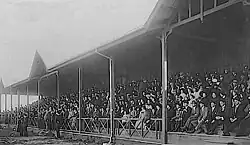 The stadium has a unique roof stand, with capacity for 500 spectators.[1] The original wooden stand had been destroyed by fire, but the club built an exact replica of it, keeping the architectural style of the 1900s.[3]