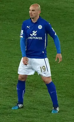 On 28 August 2014, Cambiasso signed a one-year deal with newly promoted Premier League club Leicester City, joining on a free transfer, having been released by Inter at the end of their 2013–14 season.[15][16] In his first interview since joining the club, Cambiasso cited the club's desperate pursuit of him and the lure of Premier League football as the reasons he signed.[17] He was called up for his first game three days after signing, a 1–1 draw at the King Power Stadium against Arsenal, as an unused substitute.[18] Cambiasso made his debut for Leicester on 13 September against Stoke City, coming on as a half-time substitute and impressing in the club's 1–0 win, their first of the league season.[19] His first goal was an equaliser as Leicester beat Manchester United 5–3 at home after trailing 1–3 with 30 minutes to play.[20] Cambiasso scored his second goal of the season, an opener in the fourth minute following an assist from Leonardo Ulloa, in a 3–2 loss against Queens Park Rangers at Loftus Road.[21] That was Leicester's first goal in 504 minutes without scoring, or 56 days.[22][23] On 4 April 2015, Cambiasso gave Leicester a 12th-minute lead against West Ham United in a game that the Foxes would go on to win 2–1, their first league victory in eight matches, stretching back to 10 January 2015.[24] This started a run of seven wins and one draw from Leicester's final nine Premier League fixtures, with the team finishing 14th in the table.[25]