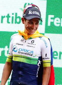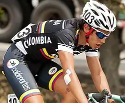 Jhoan Esteban Chaves Rubio (born 17 January 1990) is a Colombian professional road bicycle racer, who currently rides for UCI WorldTeam EF Education–EasyPost.[8] Born in Bogotá, Chaves has competed as a professional since the start of the 2012 season, having signed for the Colombia–Coldeportes team as a neo-pro,[9] after three seasons as an amateur with the Colombia es Pasión–Coldeportes team. Chaves is a two-time grand tour podium finisher, and a monument winner.