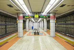 The station is located underground, with the station concourse on the 1st basement level and the platforms on the 2nd basement level. The station has one island platform serving two tracks.[1]