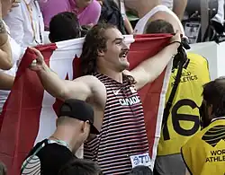 Katzberg enjoyed early success on the international competitive circuit in 2023, notably winning gold when the Diamond League held a promotional mixed-gender hammer throw event at the 2023 Meeting de Paris.[10] He won his first Canadian national title months later. Competing in his first world championships in Budapest at the 2023 World Athletics Championships, Katzberg qualified for the finals with the best throw and a national record of 81.18 m (266 ft 4 in). He threw an 81.25 m (266 ft 6+3⁄4 in) on his fifth throw, setting another new national record and winning the gold medal and world title.[11] Katzberg's victory made him both the youngest ever men's hammer throw medallist and world champion, and the first Canadian man to win a medal in the event. His victory ended the reign of five-time world champion Paweł Fajdek, who finished fourth, while he also defeated Wojciech Nowicki, the reigning Olympic champion.[12][11] Katzberg was part of a Canadian sweep of the hammer events in Budapest, along with Camryn Rogers' victory in the women's event.[13][14]