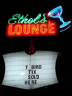 Restaurateur Glenn Smith had previously run the blues club Pop the Gator (1989–1994) and the bar Circus Room (1992–1994).[1][2] Smith opened Ethel's Lounge in 1994.[1] Smith picked the location for its desirable location in the city, as well as its parking.[1] Smith wanted the food to feel home-cooked, as opposed to typical bar food.[1] Every year, the bar runs the "Tray Race", a relay race for charity where contestants balance trays of water bottles.[3] On St. Patrick's Day 2019, a concert poster was stolen from the bar.[4] The bar has been described as a "local favourite".[5]