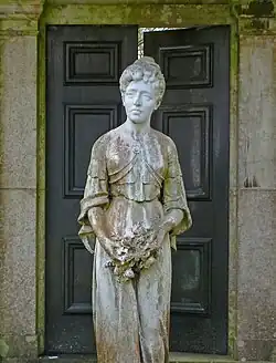 Ethel died at her home in 1911; within a year Walter had married his 22-year-old housekeeper Emily Florence Richardson.[3][5] Walter, an industrial chemist, had the memorial erected in 1913 and said he had been inspired by similar graves he had seen in Italy.[1][3] There are two suggestions as to the inspiration for the monument. The first is that it symbolises the love between the couple and depicts Ethel in the entrance to her house waiting for her husband to return home.[1] The open door indicates that she waits to be reunited with her husband in death.[5] The other is that it is a mark of regret by Walter for his womanising and that this is reflected in the sad expression on the face of the statue.[1] The sculptor of the piece is not known.[6]