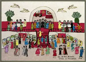 Ethel Wright Mohamed returned to embroidery after she was widowed in 1965.[5] "There is just a soothing music as the needle comes through the cloth," she told the Tuscaloosa News in 1992. She embroidered elaborate scenes based on her own memories and family life. Her colorful works found a local audience through family members, and soon they were exhibited in regional museums as folk art.[6] In 1974, her embroidered art was part of the Smithsonian Institution's Festival of American Folklife in Washington D.C. The next year, the Smithsonian commissioned a tapestry by Mohamed, for the Bicentennial Festival of American Folklife. From 1976 to 1977, twelve works by Mohamed were displayed at the Renwick Gallery. She embroidered a picture of the Renwick event, which is now in the Smithsonian American Art Museum.[7]
