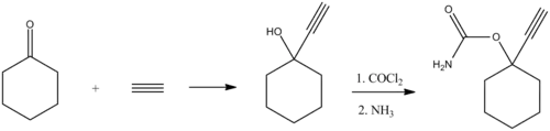 Ethinamate (1-ethynylcyclohexanone carbamate) is synthesized by combining acetylene with cyclohexanone to make 1-ethynylcyclohexanol, and then transforming this into a carbamate by the subsequent reaction with phosgene, and later with ammonia. Some lithium metal or similar is used to make the acetylene react with the cyclohexanone in the first step.[13][14]