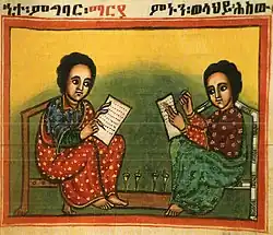 Aside from epigraphy, Aksumite historiography also includes the manuscript textual tradition. Some of the earliest Ethiopian illuminated manuscripts include translations of the Bible into Ge'ez, such as the Garima Gospels that were written between the 4th and 7th centuries and imitated the Byzantine style of manuscript art.[16][17] The Aksum Collection containing a Ge'ez codex that provides chronologies for the diocese and episcopal sees of the Coptic Orthodox Church of Alexandria in Roman Egypt was compiled between the 5th and 7th centuries.[16] These texts reveal how the Aksumites viewed history through the narrow lens of Christian chronology, but their early historiography was perhaps also influenced by non-Christian works, such as those from the Kingdom of Kush, the Ptolemaic dynasty of Hellenistic Egypt, and the Yemenite Jews of the Himyarite Kingdom.[6]