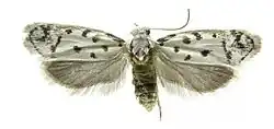 The length of the forewings is 6.3–6.8 mm (0.25–0.27 in) for males and 6.5–7.5 mm (0.26–0.30 in) for females. The ground color of the forewings is white with six defined dots distributed on two-thirds from the base. There is a line at the terminal area from almost the center of the wing to the tornum. The hindwing ground color is dark brown.