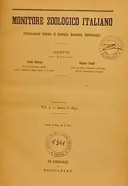 The journal was established in 1890 by Giulio Chiarugi and Eugenio Ficalbi (who edited it until 1922) as the Monitore Zoologico Italiano.[1] From the start, a specific interest is declared for zoology, anatomy, and embryology. The Unione Zoologica Italiana was founded in 1900[2] and in the same year the Monitore became its official journal. In 1923 Ficalbi was succeeded by Angelo Senna. From 1930 to 1933 the journal also became the official journal of the Società Italiana di Anatomia.[1] Since 1934 it is no longer the organ of the Unione Zoologica Italiana and from 1934 to 1966 it is only the organ of the Società Italiana di Anatomia of which the proceedings of the conferences are published. Until 1943 it was edited by Chiarugi and Senna. In 1944 Giuseppe Colosi took over and edited the journal until 1967. In addition to Colosi, in 1946 Nello Beccari and Senna joined as editors. In 1951 Ignazio Fazzari replaced Senna. From 1957 on, the editors were Colosi, Fazzari, and Emanuele Padoa. In 1962 Leo Pardi also became part of the editorial committee.