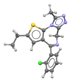 Etizolam (marketed under numerous brand names) is a thienodiazepine derivative[5] which is a benzodiazepine analog.[6] The etizolam molecule differs from a benzodiazepine in that the benzene ring has been replaced by a thiophene ring and triazole ring has been fused, making the drug a thienotriazolodiazepine.[7][8]